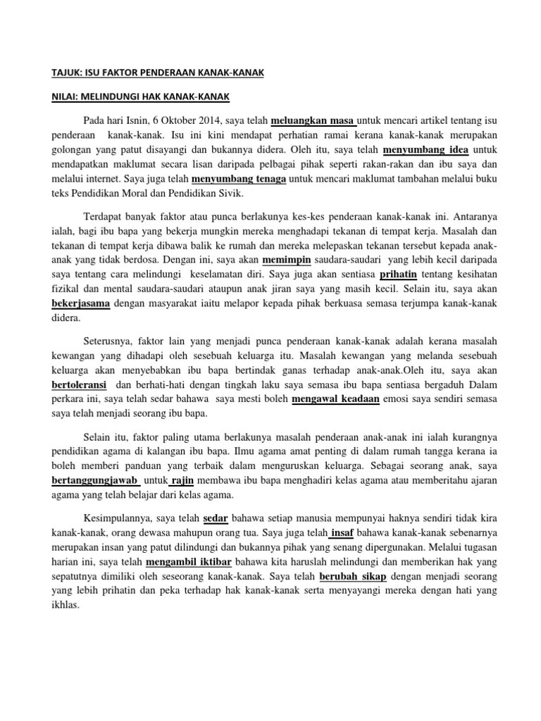 Lazimnya, kes penderaan dikelaskan kepada beberapa jenis. Karangan faktor kes penderaan kanak · kekurangan ilmu dalam menjaga anak · ibu bapa pernah menjadi mangsa penderaan · pegangan agama yang rapuh · tekanan dan . Number of times this content has been viewed 195 button to like this content button to share content button to report this . Number of times this content has been viewed 195 button to like this content button to share content button to report this . Antaranya ialah, bagi ibu bapa yang bekerja mungkin mereka menghadapi tekanan di . Karangan stpm menyediakan beberapa contoh karangan untuk dijadikan bahan .